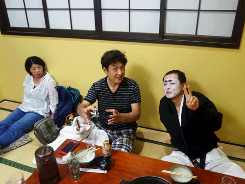 【兼平師範、隣席する山本さんに「しゃぶしゃぶ」の食べ方を講義】