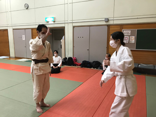 当日は、北海道合気道連盟会長・合気道旭川道場初代道場長・同道場顧問の兼平師範による特別稽古が行われました。兼平師範は、杖を用いて合気道体術につながる体捌きをはじめ、合気道を修練する者の心構えや姿勢について、開祖のエピソードを交えながらわかりやすく教授してくれました。